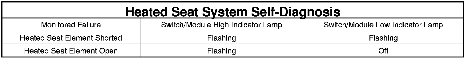 The heated rear seat system is capable of performing some self-diagnostics. The following table depicts the various monitored failures which will be reported to the vehicle operator or technician by flashing the individual heated seat switch/module Light Emitting Diode (LED) indicator lamps. Heated Rear Seat System Self-Diagnosis Table for failure identification. The left heated seat switch/module indicator lamps will flash if a failure occurs in the left rear heated seat, and the right heated seat switch/module indicator lamps will flash for a right rear heated seat failure. If a monitored heated rear seat system failure occurs, the switch/module indicator lamps will flash at a pulse rate of about one-half second on, followed by about one-half second off for a duration of about one minute after the switch/module for the inoperative heated rear seat is depressed in either the Low or High direction. This process will repeat every time the inoperative heated seat switch/module is actuated until the problem has been corrected.