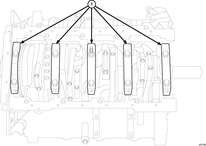5. Install all main bearing caps (1) with the arrows facing forward.
