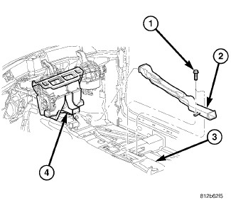 3. Install the two screws (1) that secure the floor console duct to the center floor panel (3). Tighten the screws to 2.2 Nm (20 in. lbs.).