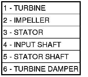 The turbine (1) is the output, or driven, member of the converter. The turbine is mounted within the housing opposite the impeller, but is not attached to the housing. The input shaft is inserted through the center of the impeller and splined into the turbine. The design of the turbine is similar to the impeller, except the blades of the turbine are curved in the opposite direction.