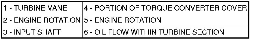 The torque converter is a hydraulic device that couples the engine crankshaft to the transmission. The torque converter consists of an outer shell with an internal turbine (1), a stator (3), an overrunning clutch, an impeller (2), and an electronically applied converter clutch. The converter clutch provides reduced engine speed and greater fuel economy when engaged. Clutch engagement also provides reduced transmission fluid temperatures. The converter clutch engages in third through fifth gears. The torque converter hub drives the transmission oil (fluid) pump.