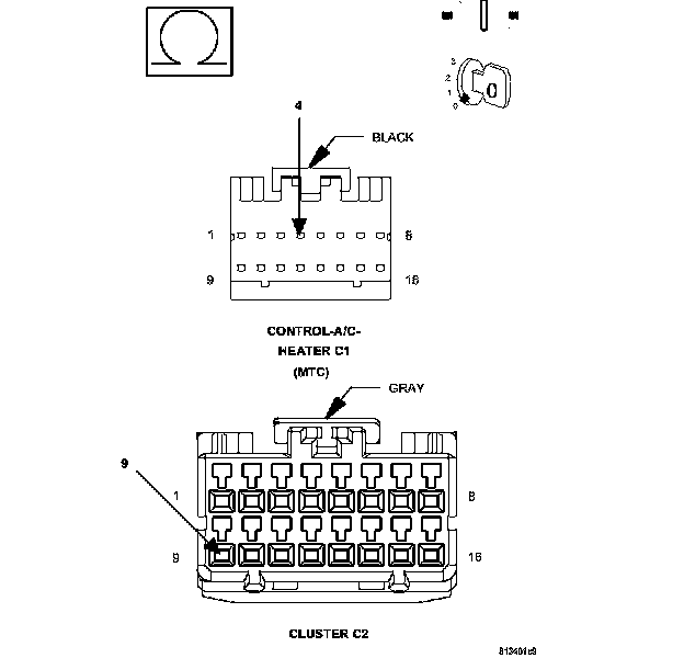 3. Measure the resistance of the (C105) HVAC MUX Control circuit between the A/C Heater Control C1 harness connector and the Instrument Cluster C2 harness connector.