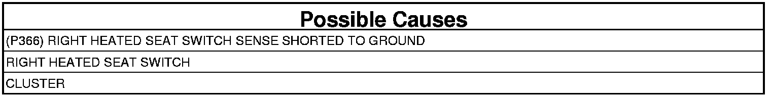 - Repair the (P366) Right Heated Seat Switch sense circuit for a short to ground.