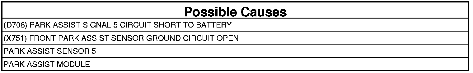 - Repair the (D708) Park Assist Signal 5 circuit for a short to battery.