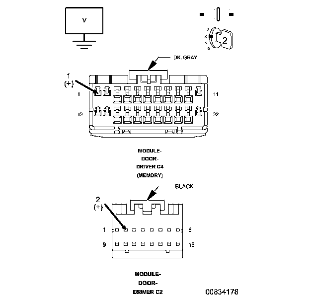 5. Measure the voltage on the (A913) Fused B(+) circuit at the Driver Door Module C2 or C4 connector and compare to voltage at the vehicle battery.