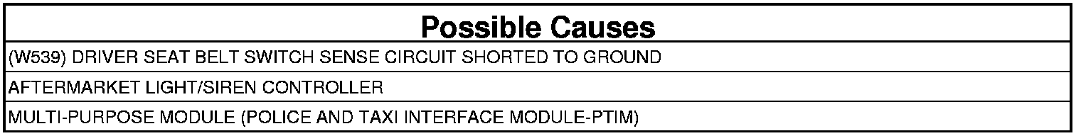 - Repair the (W539) Driver Seat Belt Switch Sense circuit for a short to ground.