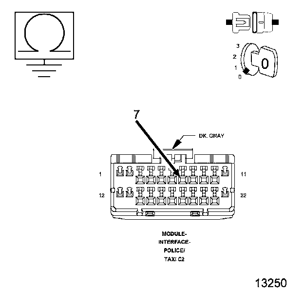 3. Measure the resistance of the (W539) Driver Seat Belt Switch Sense circuit between ground and the Multi-Purpose Module (Police And Taxi Interface Module-PTIM) C2 harness connector.