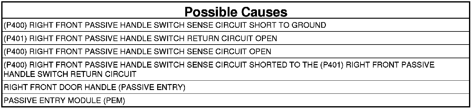 - Repair the (P400) Right Front Passive Handle Switch Sense circuit for a short to the Right Front Passive Handle Switch Return circuit.