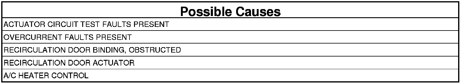 The purpose of actuator calibration is to determine the total span of door travel between physical stops. To calibrate the actuator, the A/C Heater Control first moves the door to its soft stop, and then counts the number of pulses it takes to move the door to its other stop. An expected range of span is stored in the control's memory. If the A/C Heater Control detects too few commutator pulses when calibrating the recirculation door, this DTC will set.