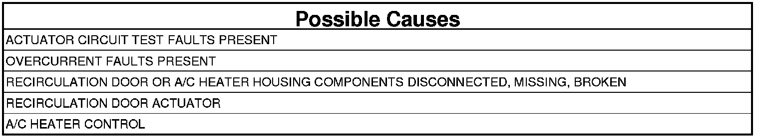 The purpose of actuator calibration is to determine the total span of door travel between physical stops. To calibrate the actuator, the A/C Heater Control first moves the door to its soft stop, and then counts the number of pulses it takes to move the door to its other stop. An expected range of span is stored in the control's memory. If the A/C Heater Control detects and excessive amount of commutator pulses when calibrating the recirculation door, this DTC will set.