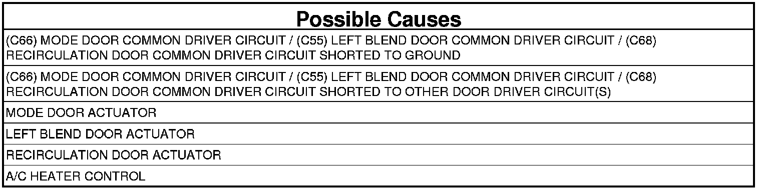 If the A/C Heater Control detects a short to ground on the (C66) Mode Door Common Driver circuit / (C55) Left Blend Door Common Driver circuit / (C68) Recirculation Door Common Driver circuit.