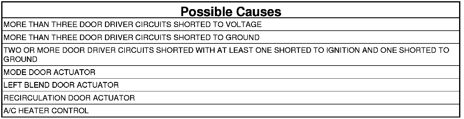 If the A/C Heater Control detects more than three door driver circuits shorted in the same direction (e.g. four door driver circuits all shorted to ground) or if two or more door driver circuits are shorted with at least one door driver circuit shorted to voltage and one door driver circuit shorted to ground.