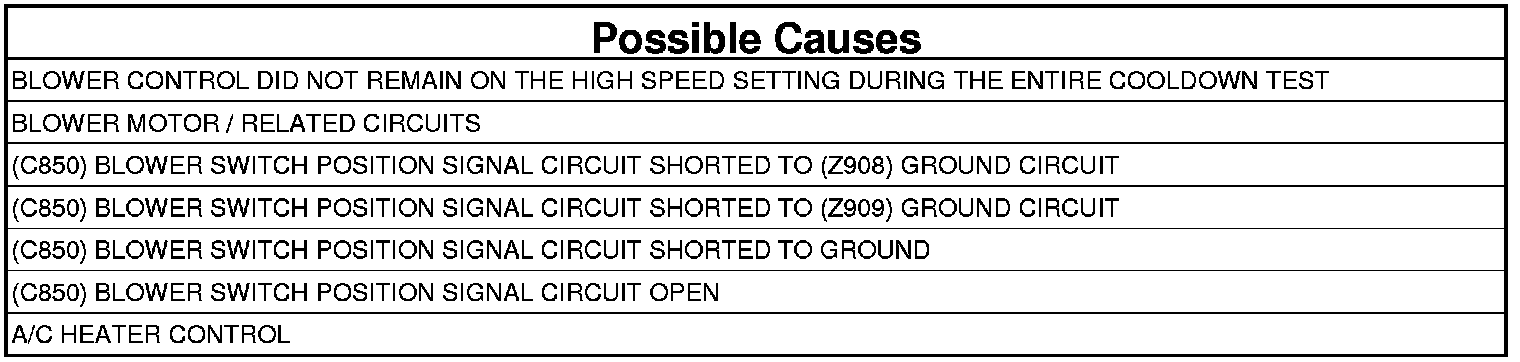 - Repair the (C850) Blower Switch Position Signal circuit for a short to the (Z909) Ground circuit. Run the Cooldown Test again after the repair is complete.