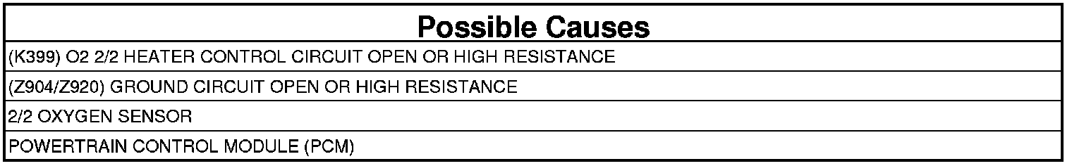 - Repair the (K399) O2 2/2 Heater Control circuit for an open circuit or high resistance.