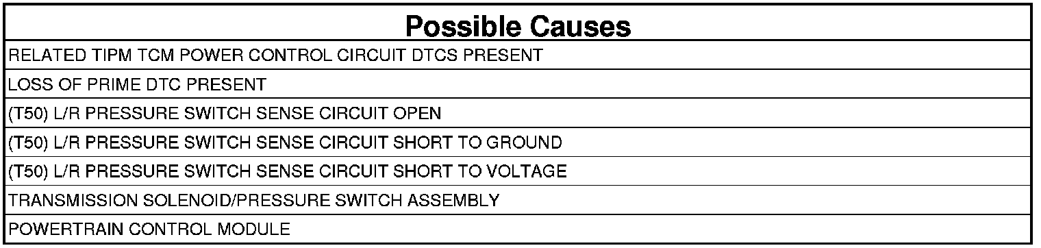 The DTC is set if one of the pressure switches are open or closed at the wrong time in a given gear. If the problem is identified for 3 successive key starts, the transmission will go into Limp-in mode and the MIL will turn on after 10 seconds of vehicle operation.