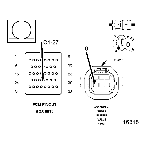 1. Using the wiring diagram/schematic as a guide, inspect the wiring and connectors between the Short Runner Valve Assembly and the Powertrain Control Module (PCM).