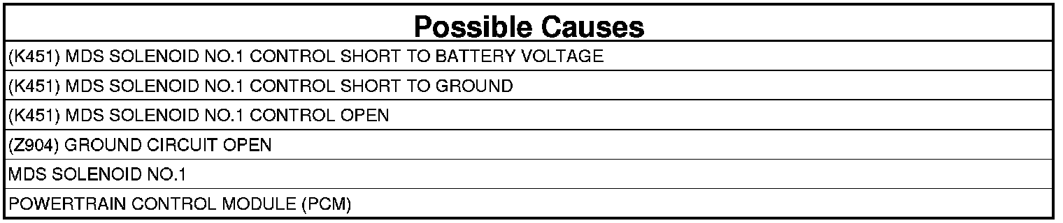 - Repair the short to battery voltage in the (K451) MDS Solenoid No.1 Control circuit between the PCM harness connector and C100 harness connector.
