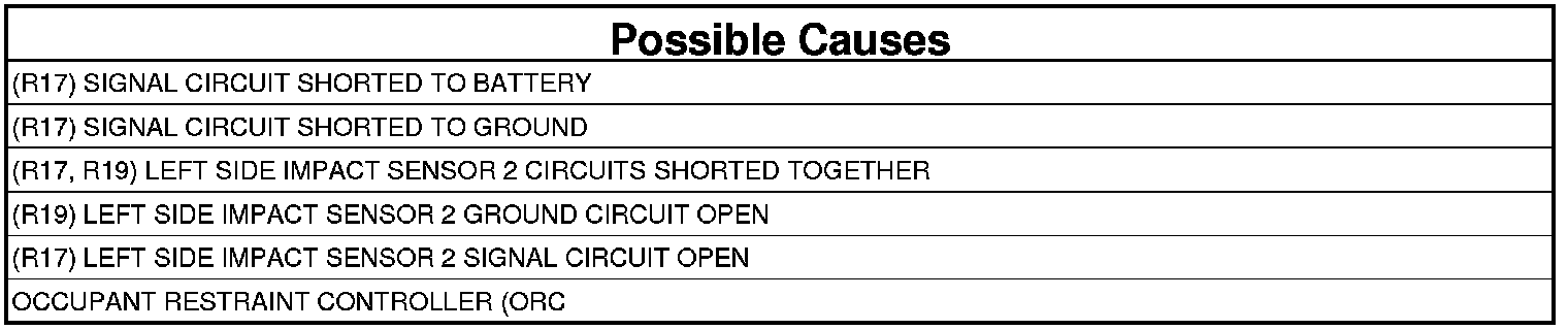 - Repair the (R17) Left Side Impact Sensor 2 Signal circuit for an open or high resistance.