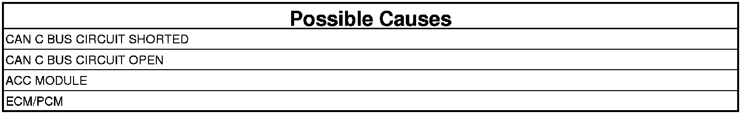 The ACC Module receives an implausible (default/error value or toggle error or parity error are present) message from the Engine Control Module (ECM) or Powertrain Control Module (PCM) for 600 millisecond. The ACC module will disable the ACC system and the ACC UNAVAILABLE message will display in the Cabin Compartment Node (CCN). Once the Diagnostic Trouble Code (DTC) goes to stored, the ACC system will return to normal operation. The DTC will be cleared after the ACC Module sees 100 consecutive key cycles of the STORED DTC.