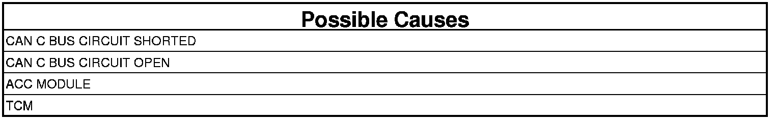 The ACC Module receives an implausible (default/error value or toggle error or parity error are present) message from the Transmission Control Module (TCM) for 600 millisecond. The ACC module will disable the ACC system and the ACC UNAVAILABLE message will display in the Cabin Compartment Node (CCN). Once the Diagnostic Trouble Code (DTC) goes to stored, the ACC system will return to normal operation. The DTC will be cleared after the ACC Module sees 100 consecutive key cycles of the STORED DTC.