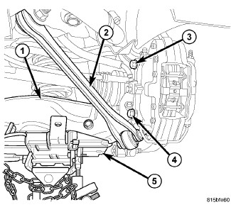 14. If equipped with SRT8 disc brakes, on each rear disc brake, support spring link (1) using a transmission jack (5) or other appropriate jack. Raise spring link just enough to access brake caliper lower mounting bolt (4) from above compression link (2).