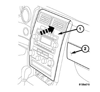 4. Install the center bezel (1) onto the instrument panel (2) and carefully push on the outside edges of the center bezel to fully seat the snap clip retainers into the instrument panel.