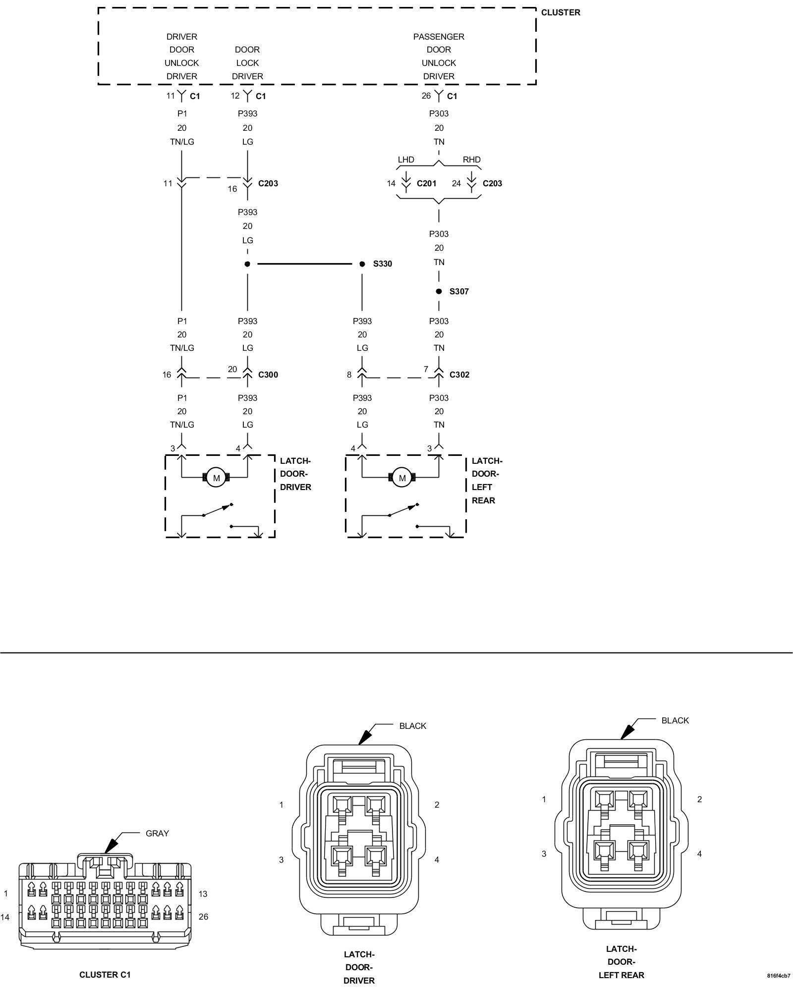 1. Measure the resistance of the (P303) Passenger Doors Unlock Driver circuit between the Cluster C1 connector and the Left Rear Door Latch connector.