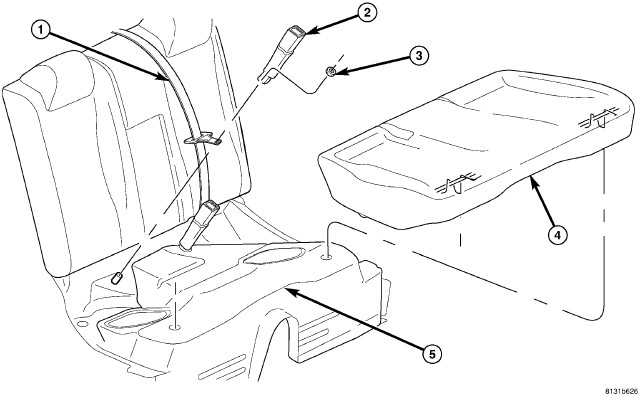 1. Pull upward at forward edge of cushion each retainer loop of the rear seat cushion to disengage retainer loops from cups in floor.