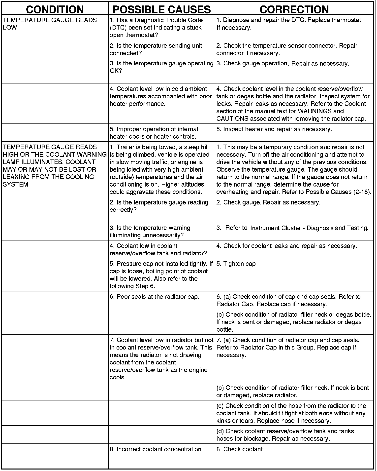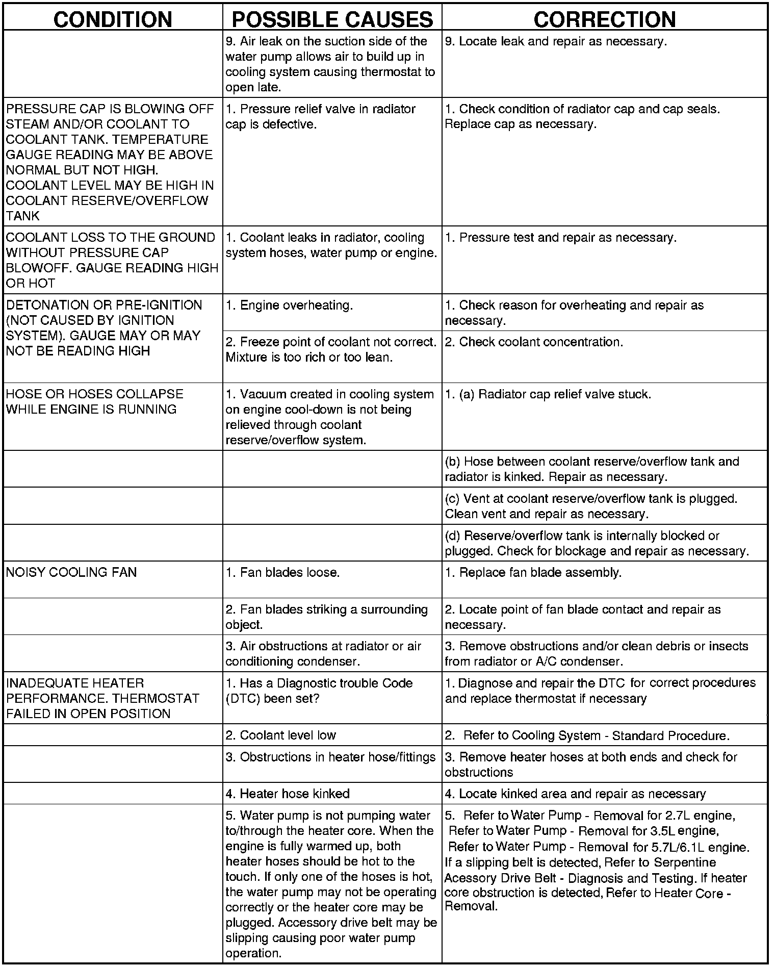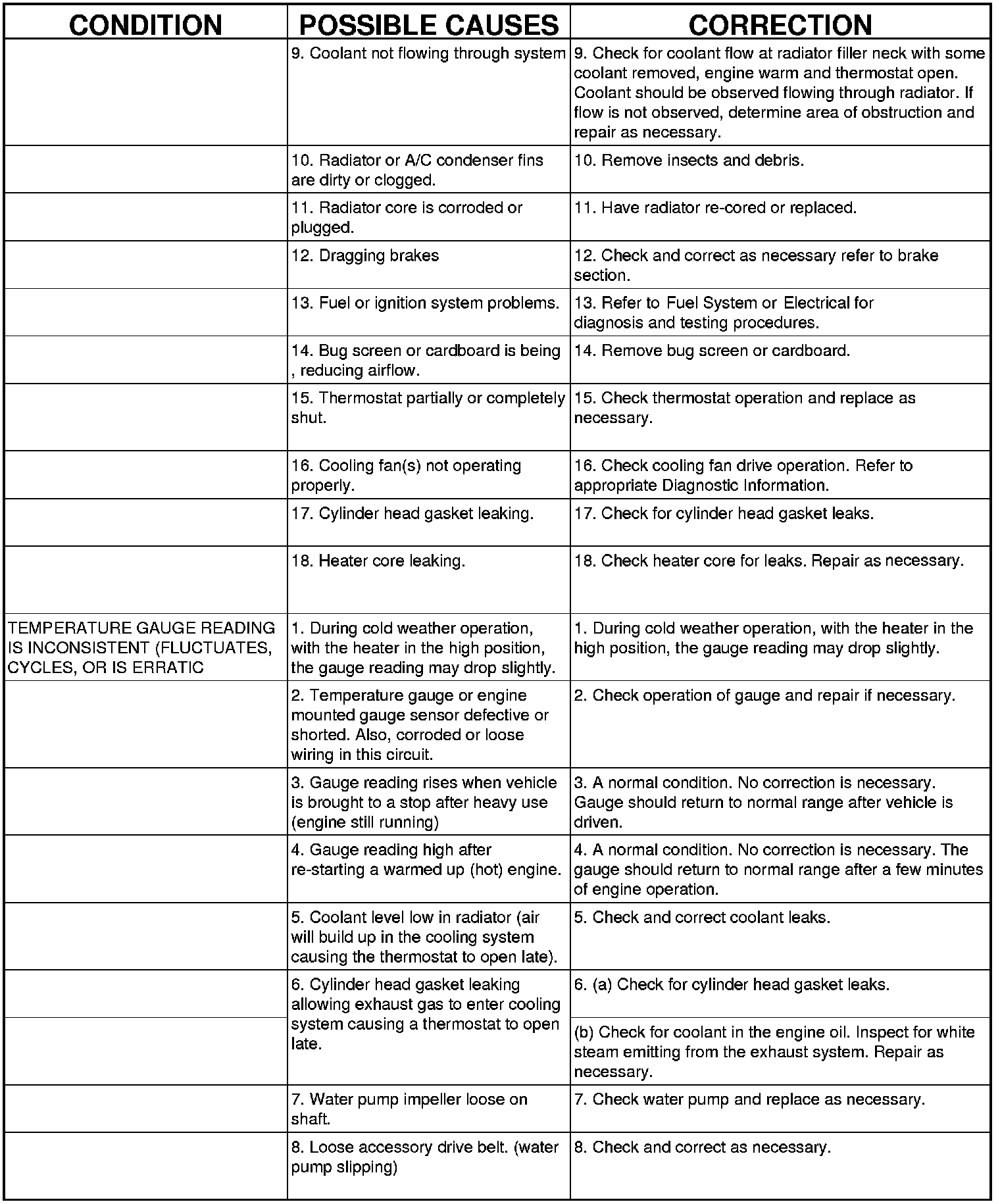NOTE: If investigation reveals none of the previous items as a cause for an engine overheating complaint, refer to COOLING SYSTEM DIAGNOSIS CHART BELOW.