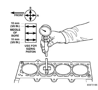 Measure the cylinder bore at three levels in directions A and B. Top measurement should be 10 mm (3/8 in.) down and bottom measurement should be 10 mm (3/8 in.) up from bottom of bore. Engine Specifications.