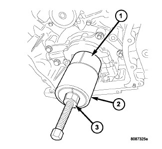 2. Remove crankshaft sprocket by first installing the crankshaft damper bolt. Apply grease or equivalent to damper bolt head and position Special Tools 5048-1(3), 5048-6 (2), and 8539 (1) on sprocket and crankshaft nose. Remove sprocket using care not to rotate the crankshaft.