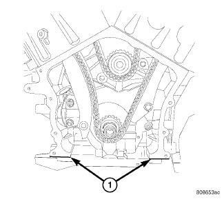2. Before installing timing cover gasket apply a 1/8 inch bead of Mopar(R) Engine RTV GEN II to the parting lines between the oil pan and cylinder block (1).