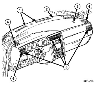 There are four instrument panel air outlets (5). One air outlet is located near each outboard end of the instrument panel facing the rear of the vehicle and two air outlets are located at the top of the instrument panel center bezel. Each of the instrument panel air outlets contain a replaceable grille with movable vanes (6) that are used to direct or shut off the flow of the conditioned air leaving the instrument panel outlets. Only the passenger side outboard instrument panel air outlet can be serviced separately. For service of the other instrument panel air outlets Instrument Cluster Bezel - Removal and Instrument Panel Bezel - Removal.