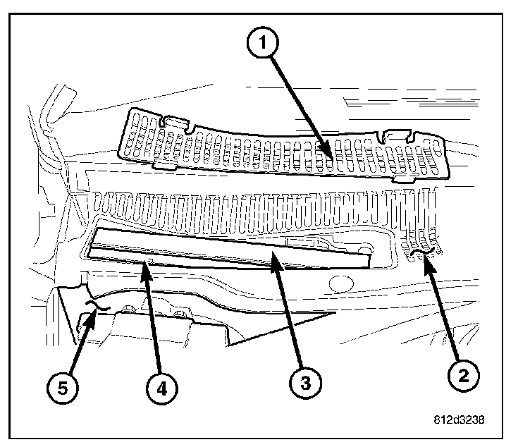 1. Remove the air inlet grille (1) from the wiper module screen (2) located near the dash panel in the engine compartment.