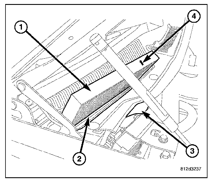 1. Install the particulate air filter (1) into the particulate air filter housing (2) located inside of the dash panel plenum (3). Insert the particulate air filter down directly into the filter housing with the arrow (4) on the filter pointing to the rear of the vehicle. The particulate air filter is held in place by friction between the filter element and the filter housing, so no fasteners are required.