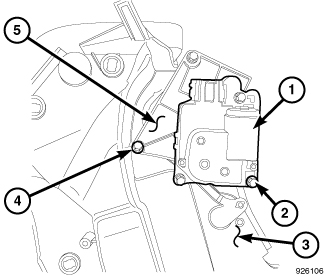 24. Position the mode door actuator (4) onto the air distribution housing. If necessary, rotate the actuator slightly to align the splines on the actuator output shaft with those on the mode door cam Mode Door Actuator - Installation.