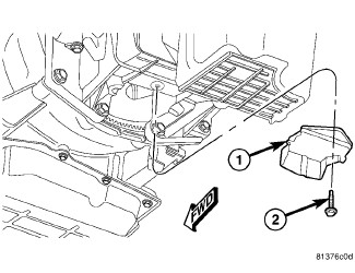 31. Install the torque converter bolt cover (1) and bolts (2). Tighten the bolts to 11 Nm (8 ft.lbs.).