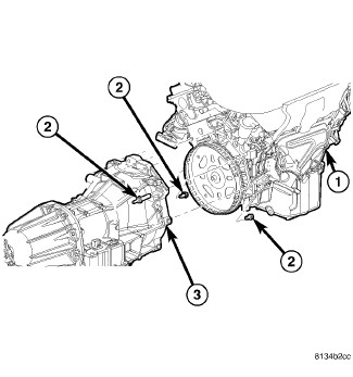 11. Raise transmission (3) and align the torque converter with the drive plate and the transmission converter housing with the engine block (1).