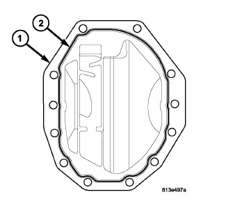 1. After thoroughly cleaning axle housing cover (1), apply a 4 mm (0.157 in.) bead (2) of Mopar(R) Axle RTV as shown.