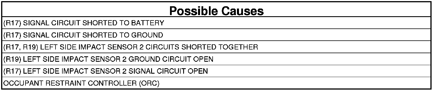 - Repair the (R17) Left Side Impact Sensor 2 Signal circuit for an open or high resistance.