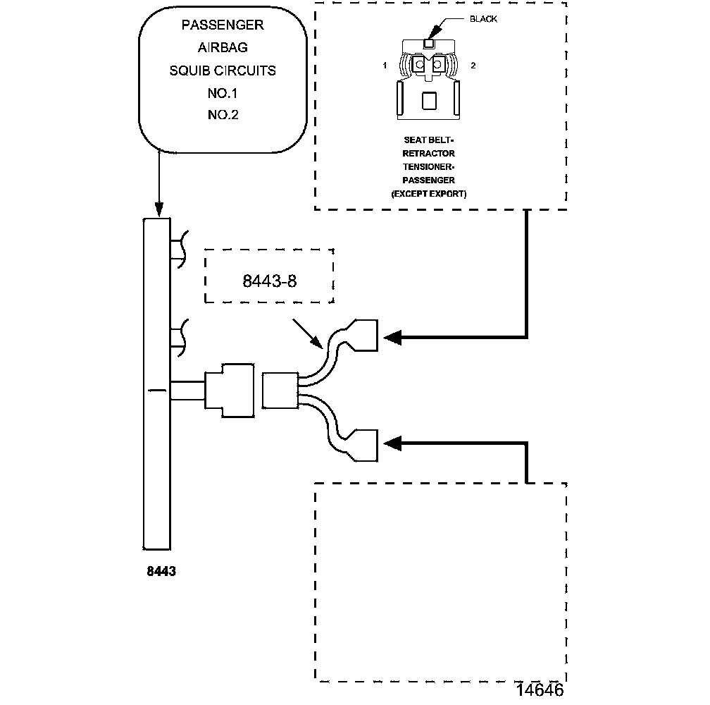 1. Disconnect the SRS Load Tool Kit 8443 and the SRS Load Tool Jumper 8443-8 (domestic) or 8443-20 (export) from the Passenger Seat Belt Retractor Tensioner connector.