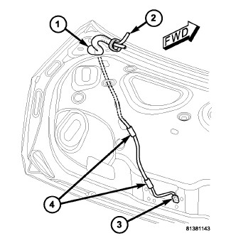 5. Engage the two retainers (4) that secure the deck lid take out (2) of the body wire harness to the underside of the deck lid.