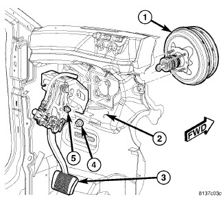 8. Slide booster push rod (5) onto brake pedal pin (4). Install NEW retaining clip (3) securing push rod to brake pedal.
