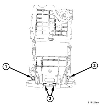 6. First tighten the M8 (1) oil pan alignment bolt to 28 Nm (250 lbs. in.), then tighten bolt (2) to 28 Nm (250 lbs. in.).