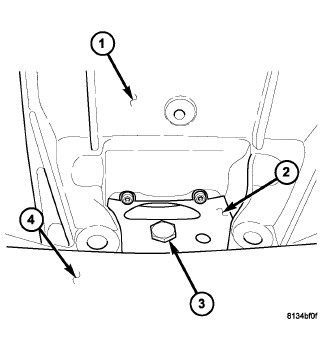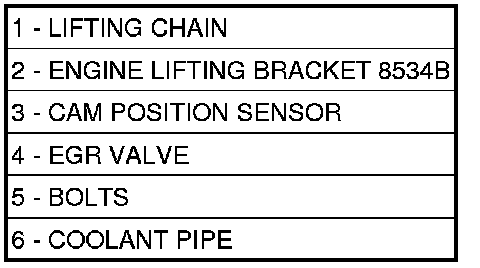 1. Install special tool 8534B, engine lifting bracket (2) to the right rear of the cylinder head and install a bolt into the inner most bolt hole (5) next to the bracket (5).