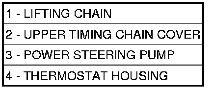 2. Connect a engine hoisting chain (1) to the left timing chain cover (2) lifting point and the engine lifting bracket.