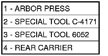 17. Install output shaft/rear carrier into rear bearing. The shaft must be pressed into position. Use special tool MD-998911 (Disc) (2) and C- 4171 and C4171-2 (Handle) (1) to press shaft into rear bearing.
