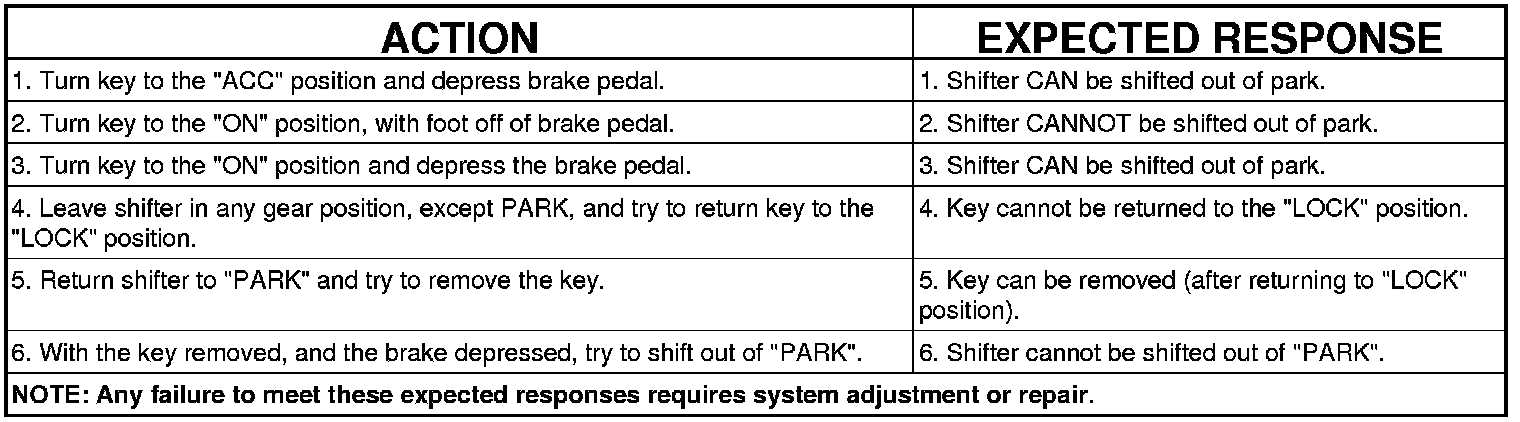 The following chart describes the normal operation of the Brake Transmission Shift Interlock (BTSI) system. If the "expected response" differs from the vehicle's response, then system repair and/or adjustment is necessary.