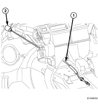 10. From under the hood, remove the shift cable grommet (2) from the dash panel.