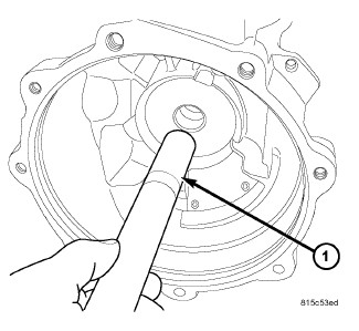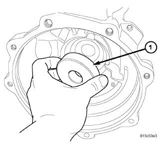 The pinion depth is set by selecting the shim (1) that fits between the pinion housing and the axle housing.